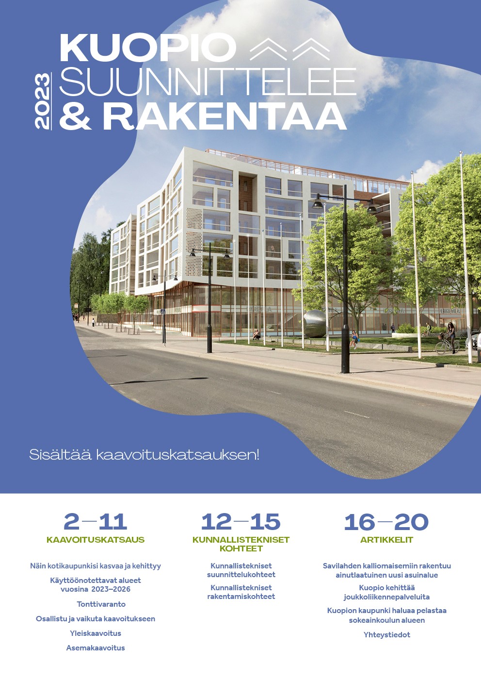 Kuopio suunnittelee ja rakentaa 2023 -julkaisu on luettavissa sähköisenä verkkolehtenä. Se on saatavilla myös pdf-versiona kaupungin verkkosivuilla.