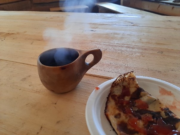 Retkellä tulee aina nälkä. Tälle retkelle lähtiessä päätettiin, että makkaran lisäksi herkutellaan muutenkin. Tikkupulla oli haaveissa, päädyimme kuitenkin paistamaan nuotioletut ja keittämään perinteiset nokipannukahvit. Talvella retken ennakkovalmistelu kylmän sään ja lyhyemmän päivän takia korostuu. Herkut kannattaa valmistella etukäteen, eli tee lettu- tai se haaveissa oleva tikkupullataikina jo etukäteen valmiiksi. Ja tietenkin pukeutuminen kelin ja liikkumisen asteen mukaan.