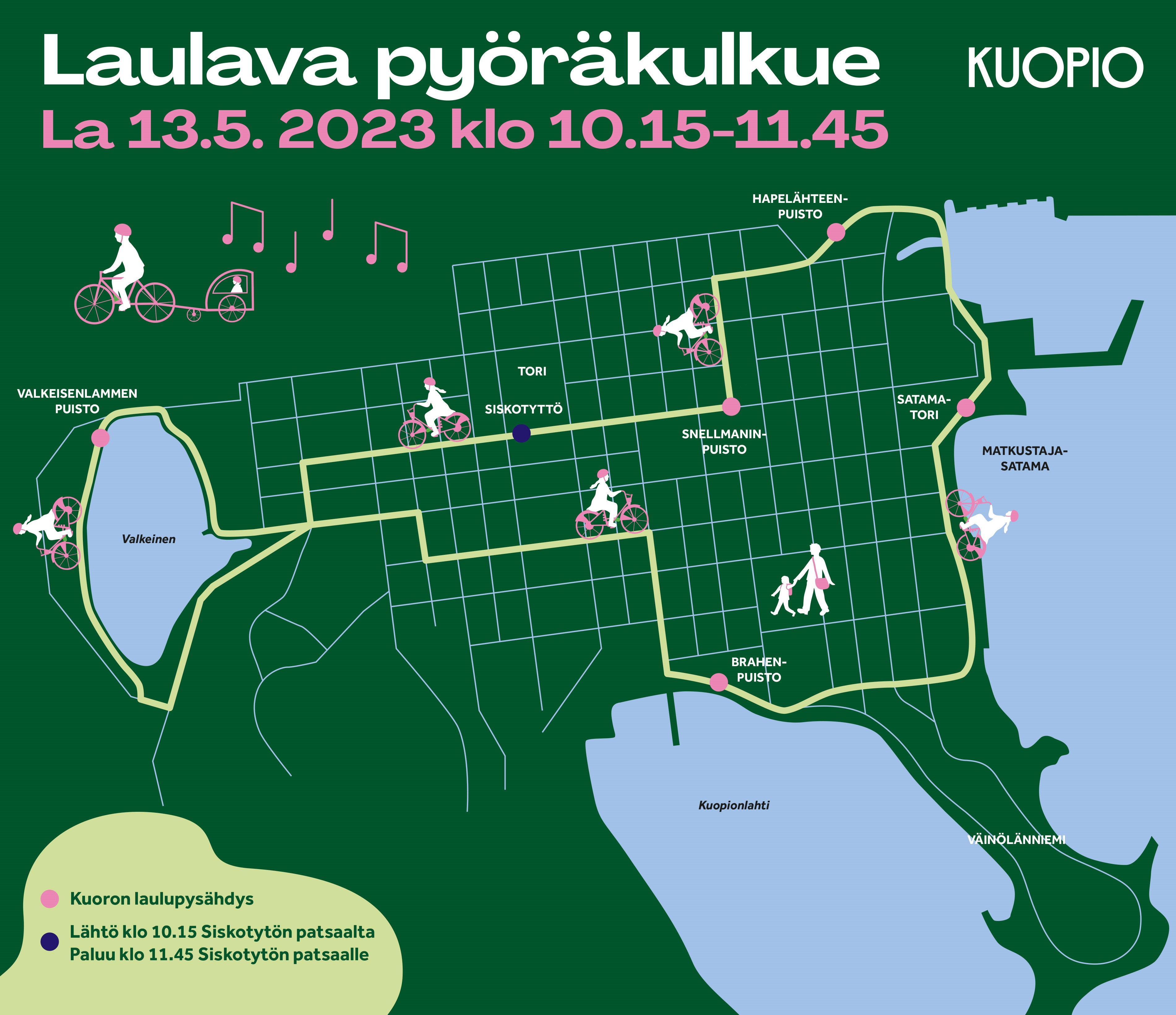 Kuoro Vox Polariksen johtama Laulava pyöräkulkue pyöräilee ja esiintyy Kuopion keskustassa lauantaina 13. toukokuuta. Kulkue alkaa torilta klo 10.15 Siskotyttö-patsaan luota. Reitti kulkee muun muassa Valkeisenlammen, Brahenpuiston ja satamatorin kautta takaisin torille, päättyen noin klo 11.45. Kulkueen lopuksi lauletaan 175-vuotias Maamme-laulu. Matkan varrella pysähdytään laulamaan kevääseen ja luontoon liittyviä kappaleita. Mukaan voi liittyä myös reitin varrelta.