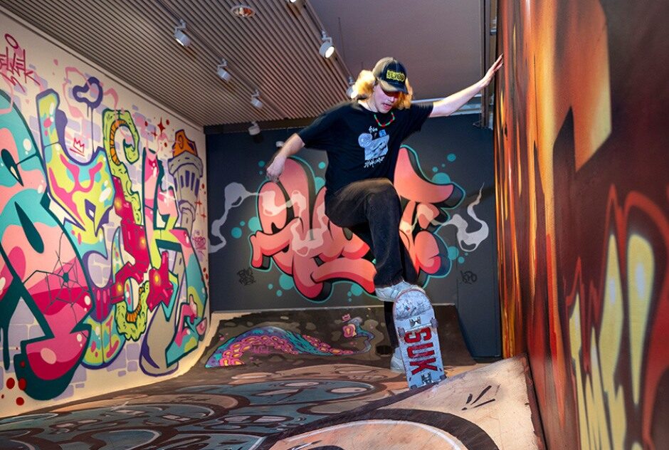 Näyttelytila on suunniteltu oleskelua varten. Siihen kuuluu keskelle näyttelyä rakennettu skedealue, jossa saa vapaasti skeitata ja skuutata. Näyttelytilan suunnittelu ja arkkitehtuuri on toteutettu yhteistyössä Savonia-ammattikorkeakoulun kanssa, jonka muotoiluopiskelijat ovat suunnitelleet ja toteuttaneet näyttelyelementit.