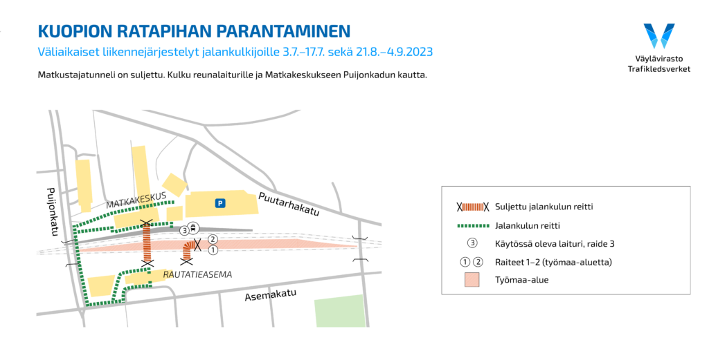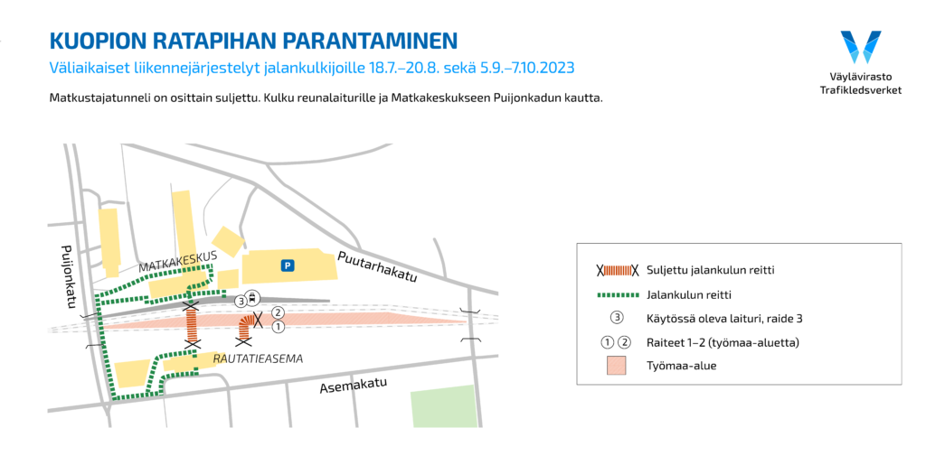 Kuopion ratapihan parantaminen käynnistyi viime vuoden syyskuussa Puijonkadun alikulkusillan pohjoisreunan rakentamisella ja henkilöratapihan muutoksilla. Matkakeskuksen puoleiselle ratapihan osalle on nyt valmistunut uusi matkustajalaituri, josta kulkee suora hissiyhteys matkustajatunneliin ja suora jalankulkuyhteys Matkaajanpolulle. Matkustajaliikenne siirtyy raiteilta 1 ja 2 raiteelle 3 sunnuntaina 18. kesäkuuta. Raiteiden 1 ja 2 laiturit suljetaan perusparannusta varten.