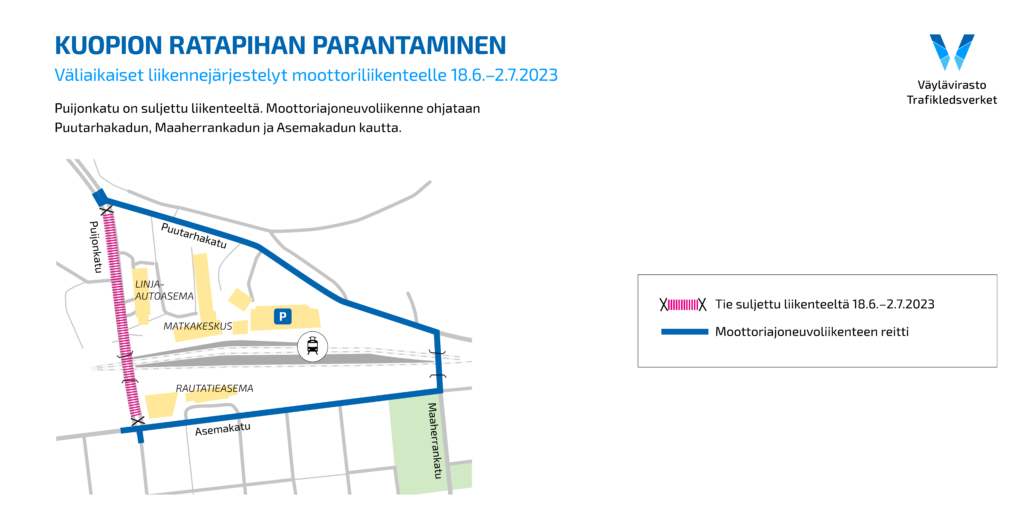 Puijonkadun alikulkusillan eteläreunan purkaminen alkaa maanantaina 19. kesäkuuta. Tämän johdosta Puijonkadun katuliikenne katkaistaan 19.6.–2.7. väliseksi ajaksi. Puijonkadun ollessa suljettuna liikenne ohjataan Puutarhakadun, Maaherrankadun ja Asemakadun kautta. Jalankulun ja pyöräilyn väylät ovat Maaherrankadulla ja matkustajatunnelissa. Lisäksi matkustajatunneli suljetaan loppukesäksi, Väylävirasto kertoo tiedotteessaan.