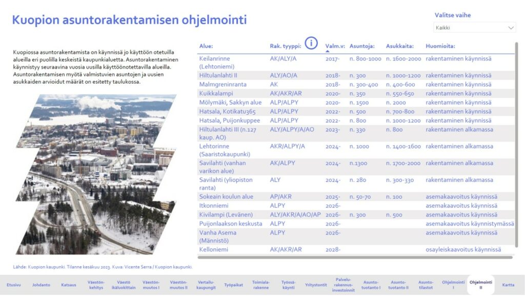 Kuopion väestöä, elinkeinoja sekä asumista koskevat lähtötiedot on koottu ja tarkistettu vuoden 2024 talousarvion laadintaa varten. Lähtötietoja käytetään perusteena myös useamman vuoden käsittävälle toiminta- ja taloussuunnittelulle, palvelujen suunnittelulle sekä kaavoitukselle. Suunnitelman taustalla ovat kaupunkirakennesuunnitelman tavoitteet tulevaisuuden kasvusuunnista, täydennysrakentamisesta sekä asumisen ja työpaikkojen laajenemisalueista. Kuopion kaupunginhallitus on hyväksynyt Kuopion väestö, työpaikat ja asuminen – asumisen rakentamisen eteneminen ja käyttöönotettavat alueet vuosina 2024–2028 -raportin 19.6.2023, § 206.