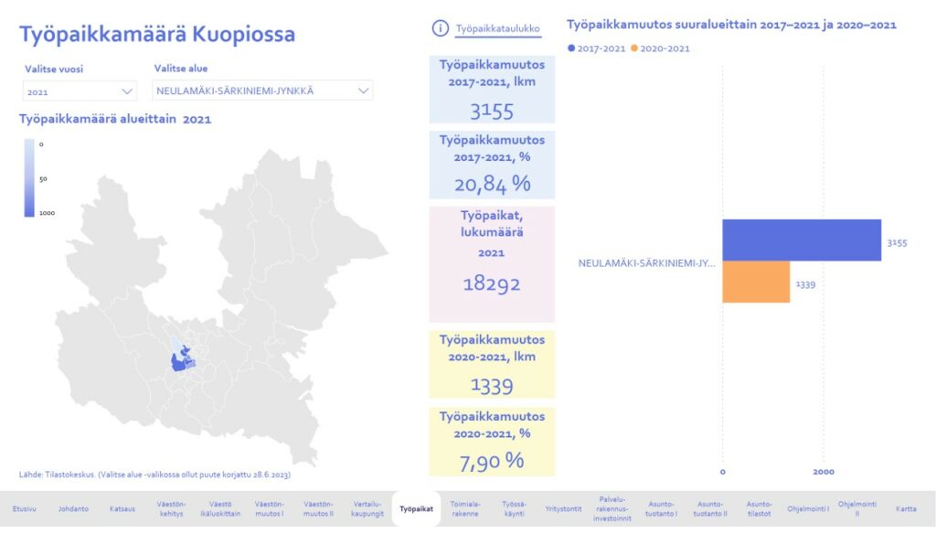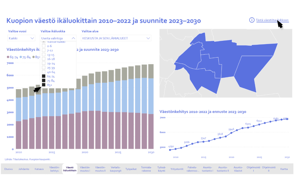 Kuopion väestö, työpaikat ja asuminen – asumisen rakentamisen eteneminen ja käyttöönotettavat alueet vuosina 2024–2028 -raportti on toteutettu Power BI –analytiikka- ja raportointityökalulla. Power BI mahdollistaa tietojen tarkastelun vuorovaikutteisena.