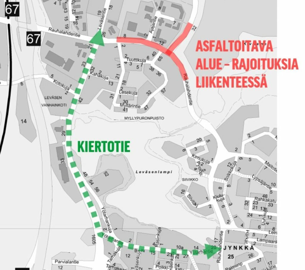 Liikenteeseen Rauhalahdentiellä tulee viivästyksiä ja rajoituksia tiistaista keskiviikkoon 3.-4.10.2023. Kannattaa välttää ruuhkaa ja liikennöintiä Rauhalahdentiellä tuona aikana. Kiertotie kulkee Yötarhantien kautta.