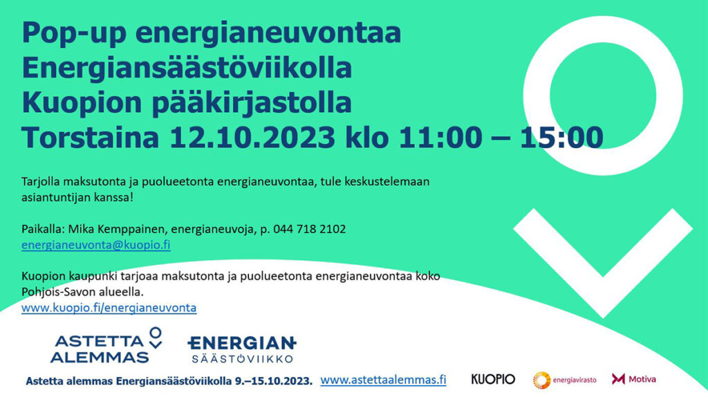 Kaupungin organisoima Pohjois-Savon energianeuvonta -hanke jalkautuu viikon aikana Kuopion pääkirjastolle torstaina 12.10., jossa energianeuvojaa voi käydä jututtamassa klo 11–15 välisenä aikana. Energianeuvonta-hanke järjestää myös kolme energia-iltaa Pohjois-Savon alueella syksyn aikana. Kuopiossa energia-ilta järjestetään kaupungintalolla tiistaina 24.10. klo 16.45-19.00. Energia-iltoja järjestetään lisäksi Iisalmessa keskiviikkona 11.10. ja Siilinjärvellä keskiviikkona 1.11. Energia-iltoihin toivotaan ilmoittautumista etukäteen kahvitarjoilujen vuoksi.