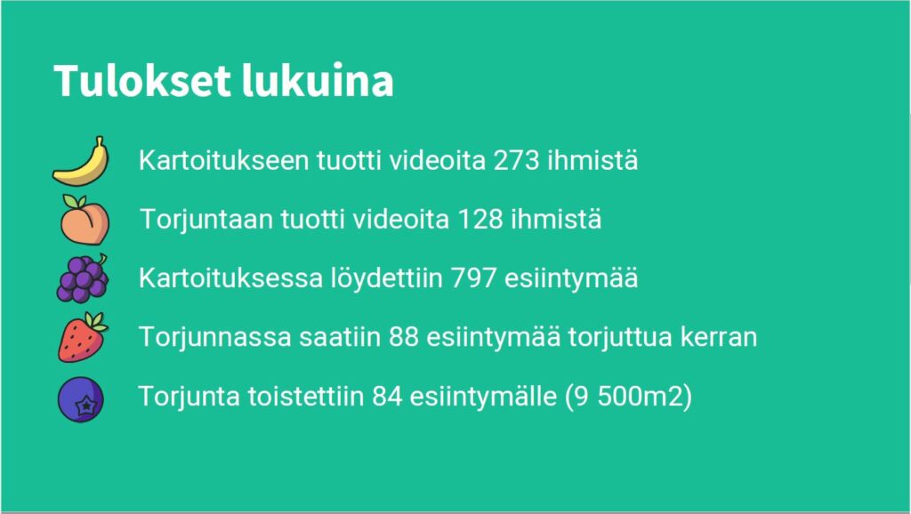 Luonnon monimuotoisuutta uhkaavia haitallisia vieraslajeja torjuttiin tänä vuonna samalla menetelmällä jopa 16 kaupungissa ympäri Suomea. Kyseessä oli ensimmäinen kerta maailmassa, kun vieraslajiongelmaa ratkaistiin mobiilipelillä joukkoistamisen keinoin.