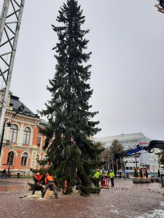 Lisäksi puun katkaisussa ovat mukana ammattitaitoiset metsurit. Kun kuusi on saatu lavettiauton kyytiin, alkaa matka kohti Kuopion toria. Kuusen saavuttua torille, se nostetaan nosturiautolla sille varattuun paikkaan. Lopuksi vielä tarkastus, että kuusi on suorassa ja sen jälkeen puu kiristetään paikalleen. Tämän jälkeen kuusen koristelu ja joulun odotus voi alkaa.