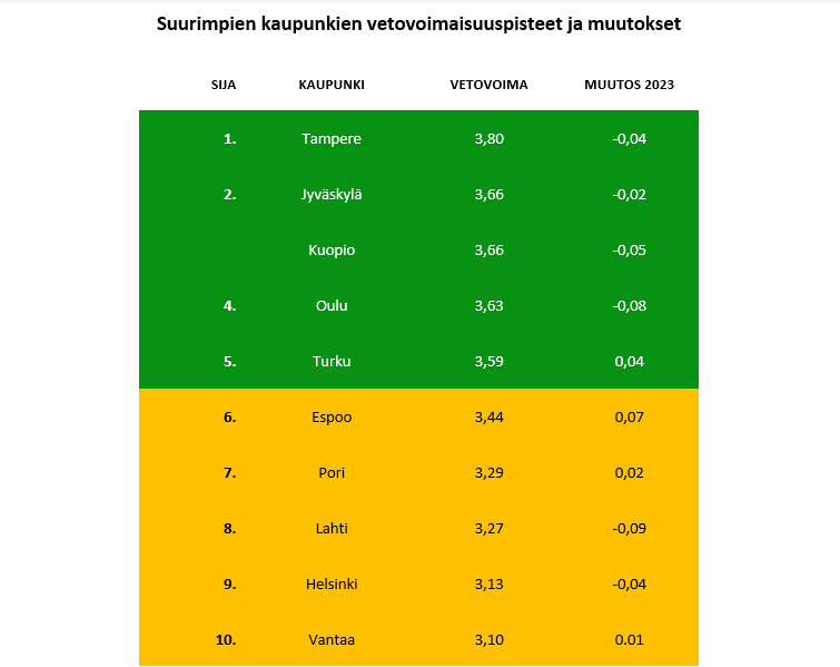 Ykköspaikkaa pitävän Tampereen keskiarvo vetovoimaisuuspisteissä on 3,80, kun taas toista sijaa jakavat Kuopio ja Jyväskylä saivat arvon 3,66. Tutkimustulosten perusteella kymmenen suurimman kaupungin vetovoima potentiaalisten uusien asukkaiden keskuudessa on laskenut lievästi edellisvuoteen nähden. Ainoastaan Espoo ja Turku ovat lisänneet vetovoimaansa.