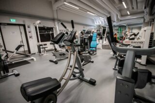 Kuntosalilla on miehille ja naisille yhteinen pukuhuone/suihkutila.